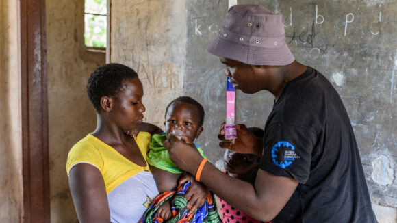 Un bambino prende una medicina da una volontaria.