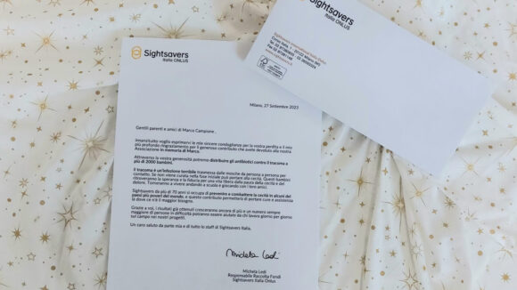 Il nostro conto corrente postale è il n° 56131840 intestato a Sightsavers Italia, Corso Italia 1, 20122 Milano. Nella causale del versamento indica “Donazione in memoria di…” con il nome della persona a cui vuoi dedicare la donazione.