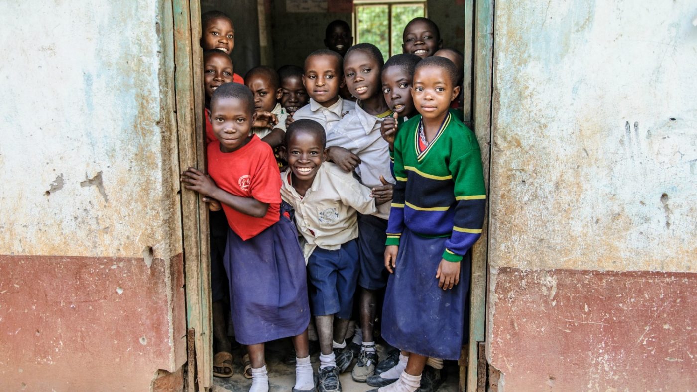 Dei bambini in fila davanti alla loro scuola in Tanzania.