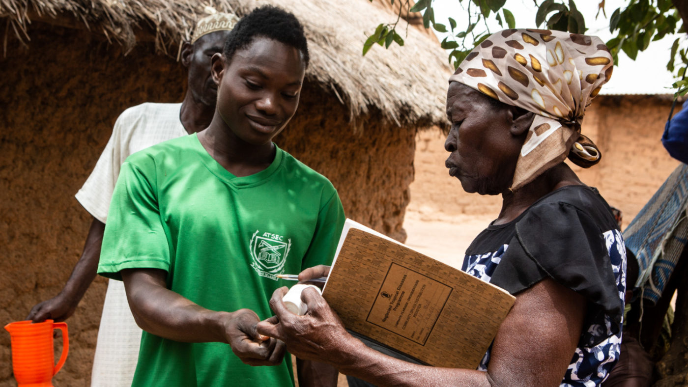 Nelle comunità rurali, volontari come Mary vanno di casa in casa e incontrano ogni famiglia. Usano il bastone della dose per misurare l’altezza di ogni persona e capire di quante compresse hanno bisogno. Tengono un diario di bordo dove segnano ogni persona la quantità di farmaco che ha ricevuto, per assicurarsi che a tutti venga somministrato il trattamento corretto e nei tempi giusti.