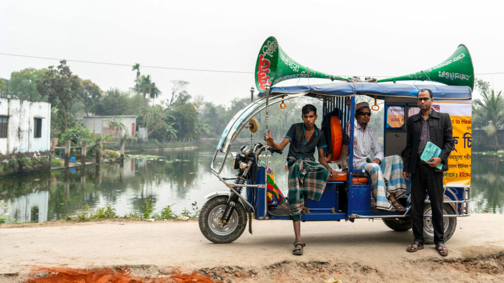Abbiamo incontrato Mokhter. Il suo compito è portare le informazioni sulla salute degli occhi alla popolazione con l'ausilio del tuk-tuk colorato: la sua voce riecheggia da un grande megafono per le strade della città di Narsingdi. Le persone sono invitate a partecipare a uno dei campi visite per la salute degli occhi di Sightsavers.